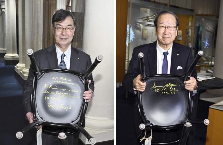 STOCKHOLM — Shimon Sakaguchi and Susumu Kitagawa, 2025 Nobel Prize winners, visited the Nobel Prize Museum in Stockholm on Saturday, where they took part in the tradition of autographing chairs in the museum.