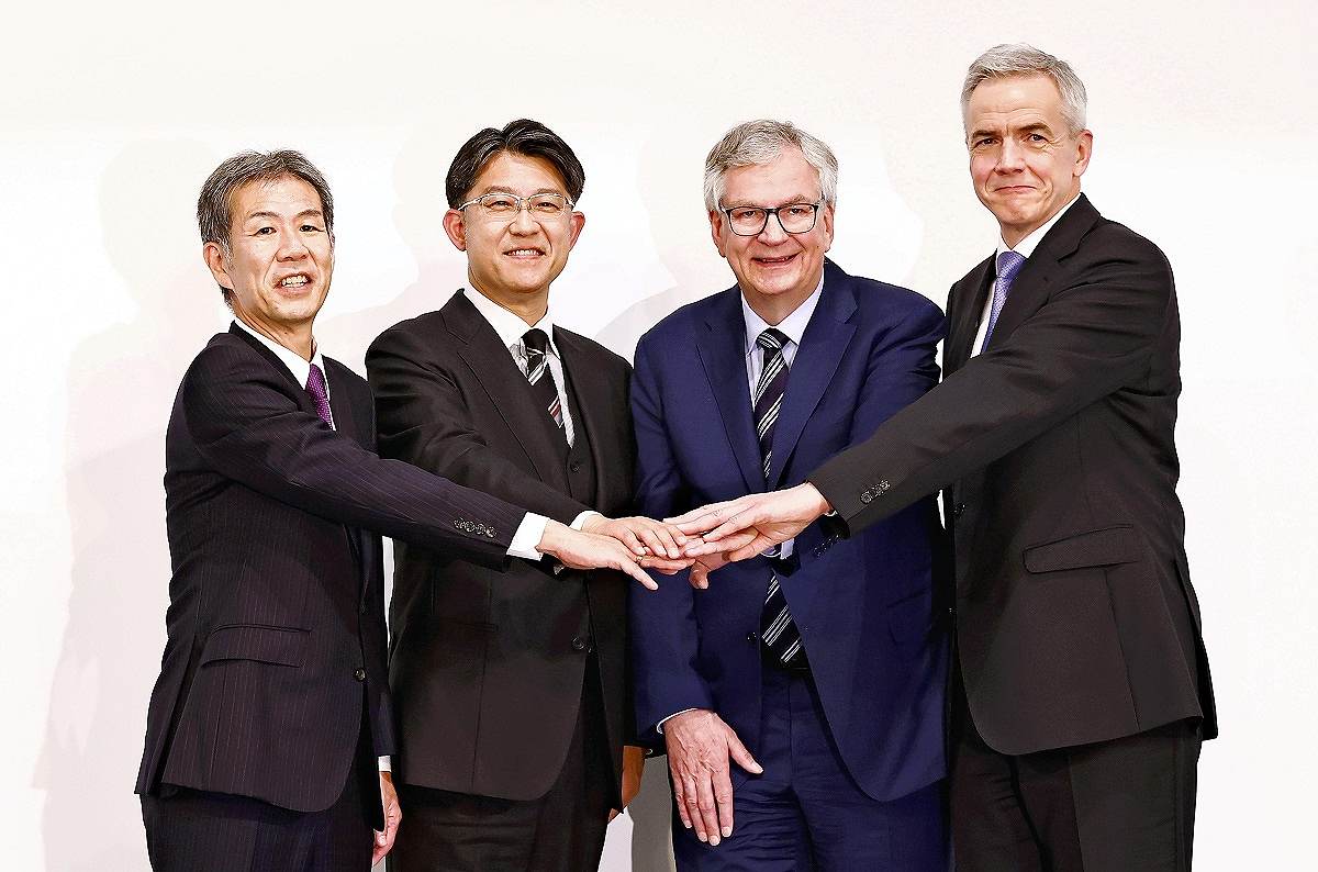 Executives from Hino Motors Ltd., Mitsubishi Fuso Truck and Bus Corp., Toyota Motor Corp. and Daimler Truck AG pose at a press conference in March 2023.