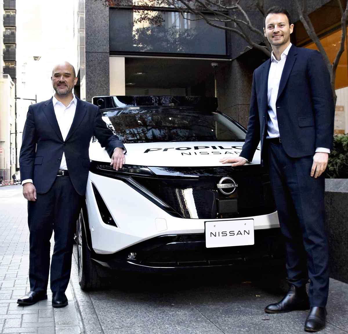Nissan Motor Co. President Ivan Espinosa, left, and Wayve Technologies Ltd. CEO Alex Kendall stand in front of a vehicle equipped with their next-generation system in Chuo Ward, Tokyo.