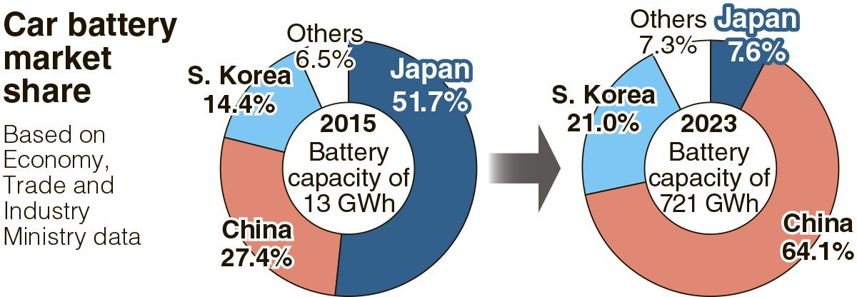 Japanese makers held a 51.7% global share of the automotive battery market in 2015, according to the Economy, Trade and Industry Ministry. However, fierce price competition has led to China holding a 64.1% share and South Korea a 21% share in 2023. Japan only had a 7.6%.