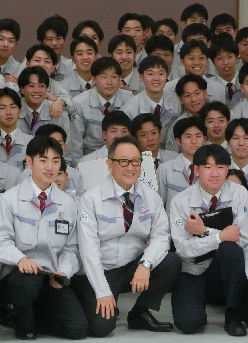 Toyota Motor Corp. Chairman Akio Toyoda, front center, is seen at Toyota Technical Skills Academy in Toyota, Aichi Prefecture, on Feb. 11. Toyoda gave a special lecture at the in-house technical training school as he promotes the development of next-generation talent.
