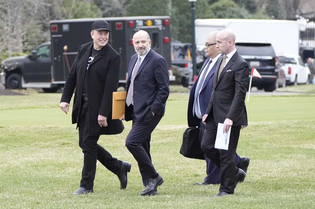 U.S. Commerce Secretary Howard Lutnick, second from left, walks to board Marine One on the South Lawn of the White House in Washington on Friday.
