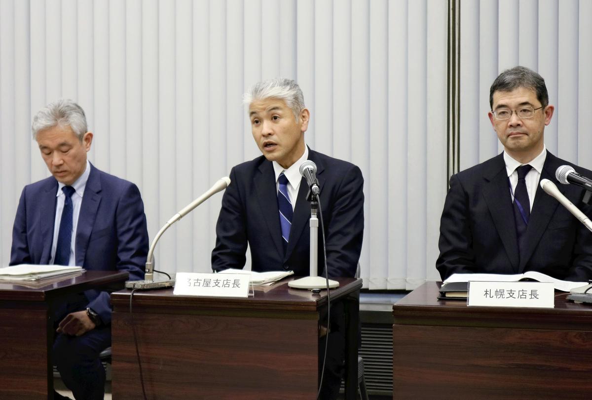 From right: BOJ branch general managers Yoshiki Okamoto from Sapporo Branch, Atsushi Dono from Nagoya Branch and Kenji Sakuta from Fukuoka Branch attend a press conference in Tokyo on Monday.