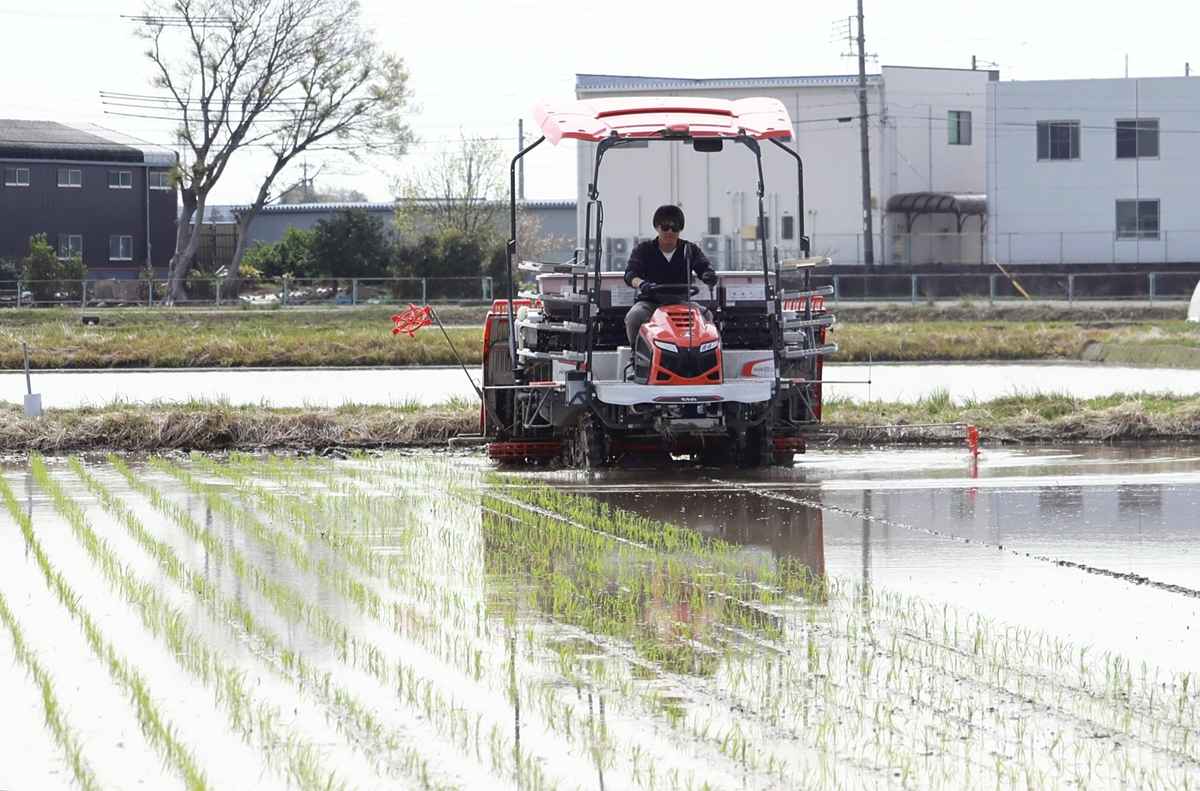 A rice producer plants early-season Akita Komachi rice in Yatomi, Aichi Prefecture, on April 11.