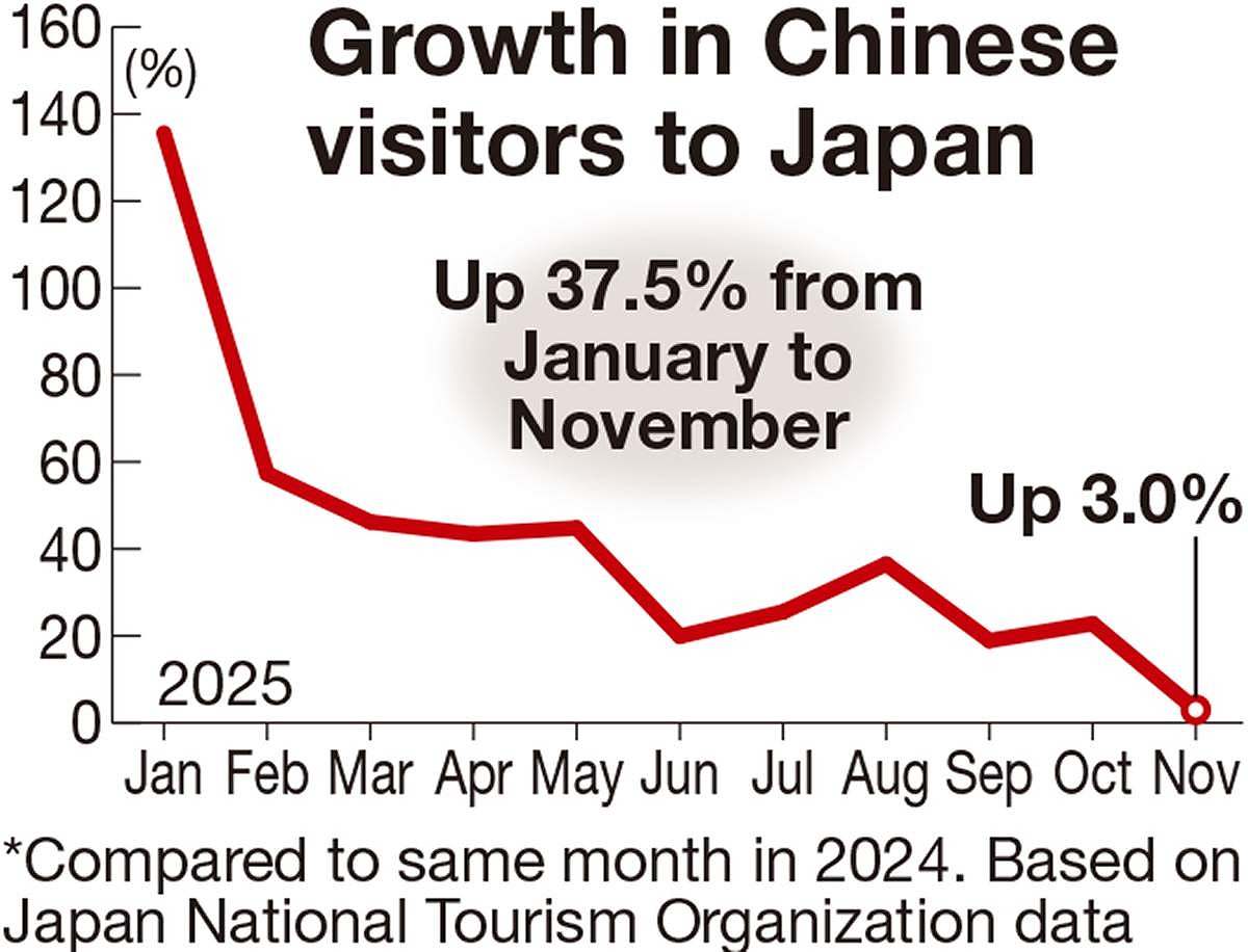 Visitors from mainland China and Hong Kong together accounted for 28% of all tourists to Japan from January to November this year. During this period, the number of Chinese tourists coming to Japan surged by 37.5% from the same period in 2024. However, that growth fell to just 3% in November. Flights between China and Japan have been reduced and cruise ships are axing stops at Japanese ports. The prospects for an improvement in this situation remain murky.