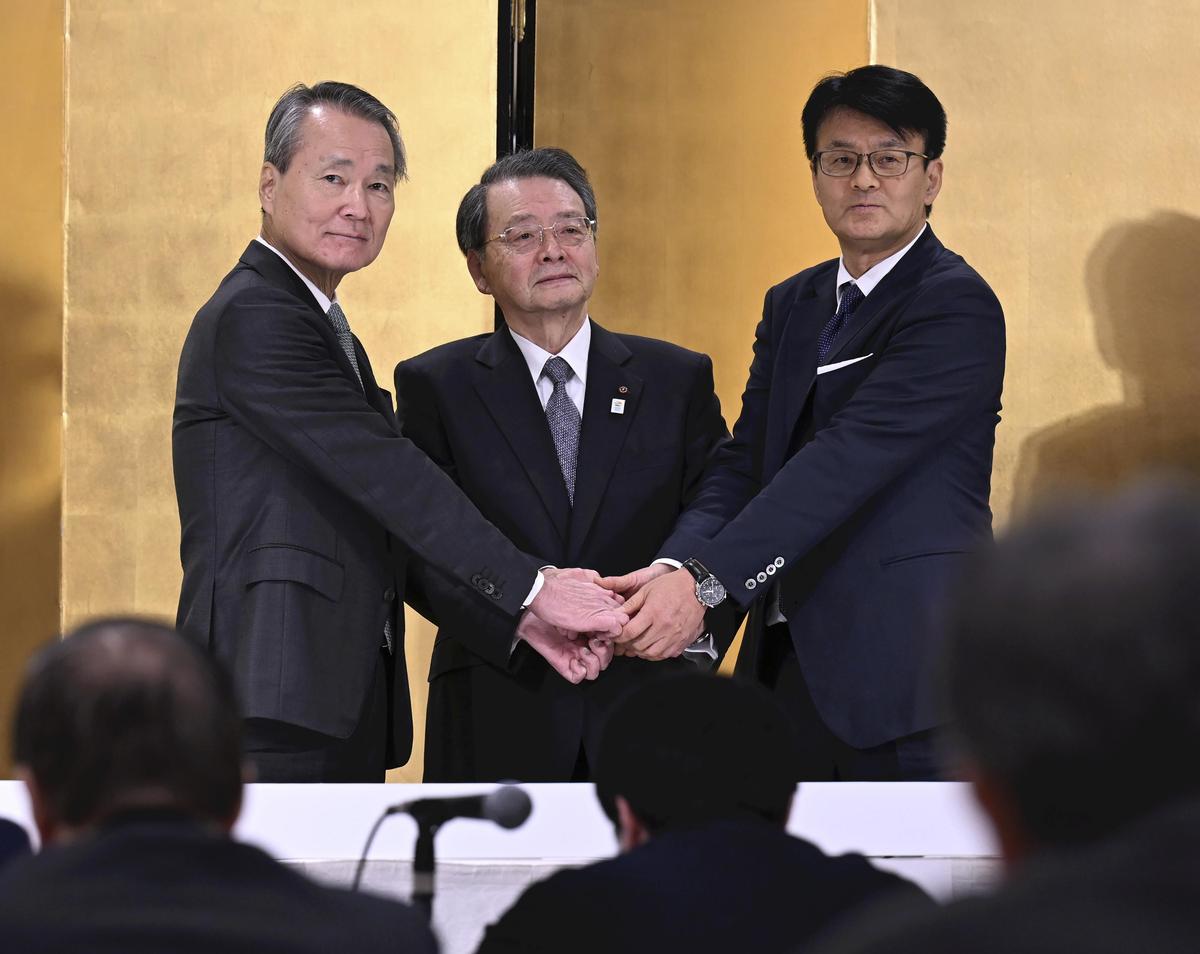 Keidanren Chairman Yoshinobu Tsutsui, left, Japan Chamber of Commerce and Industry Chairman Ken Kobayashi, center, and Keizai Doyukai Chairperson Akio Yamaguchi pose for pictures following their joint press conference on Tuesday in Tokyo.