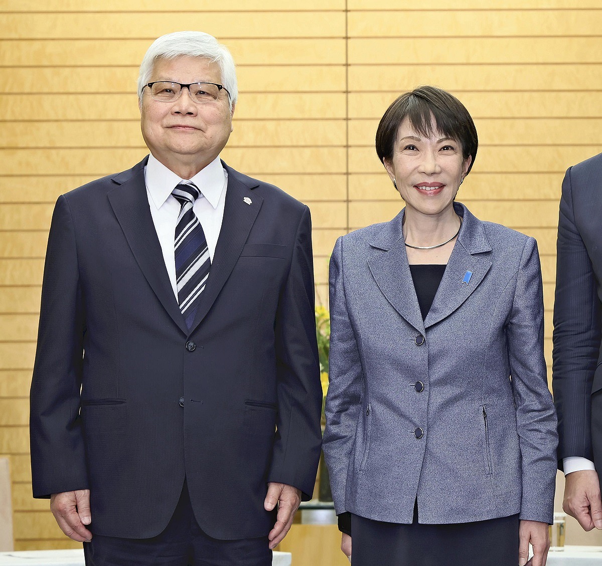 Prime Minister Sanae Takaichi, right, and C.C. Wei, chairperson of Taiwan Semiconductor Manufacturing Co., pose for a photo at the Prime Minister’s Office on Thursday.