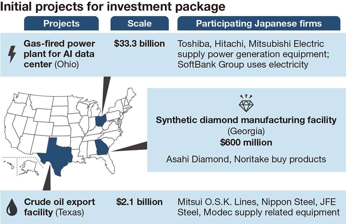 Japan and the United States have chosen three inaugural projects to kick off a $550 billion (about ¥84 trillion) investment package in the United States.