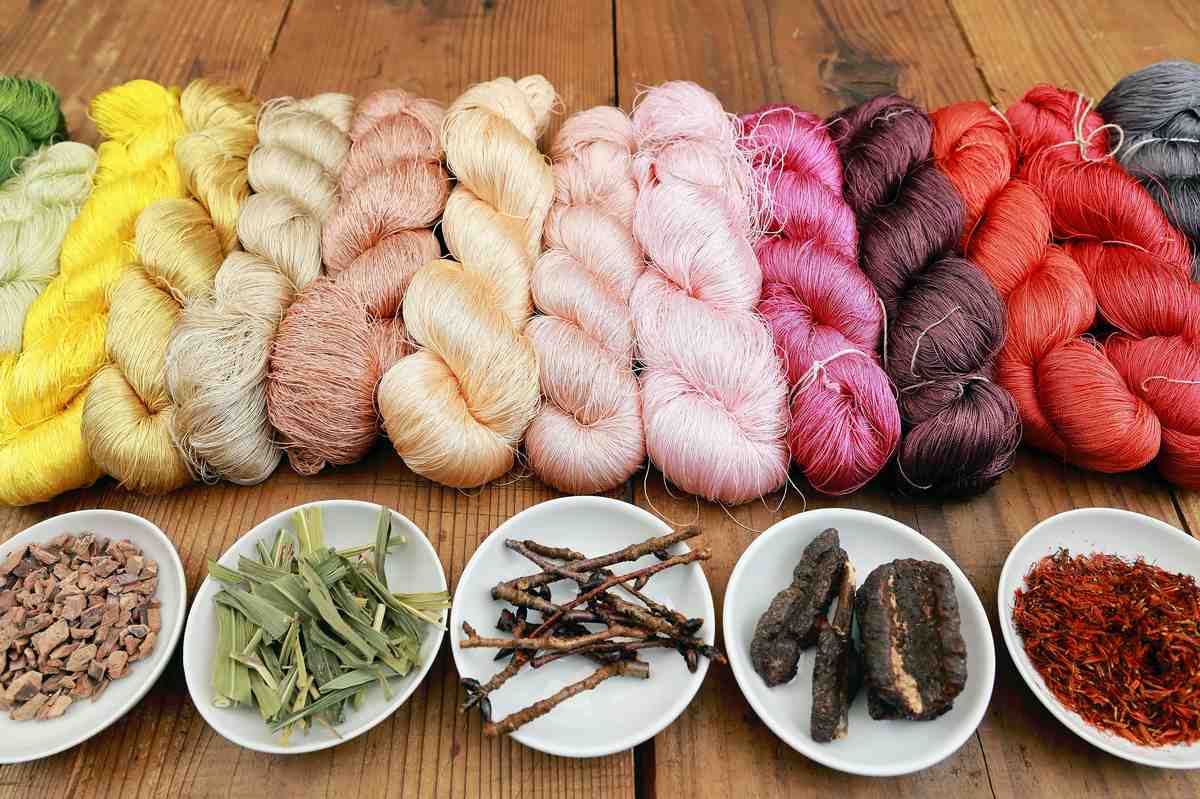 Hanks of yarn dyed with a traditional technique using cherry blossoms, safflower and other natural ingredients are seen with ingredients for plant dyeing.