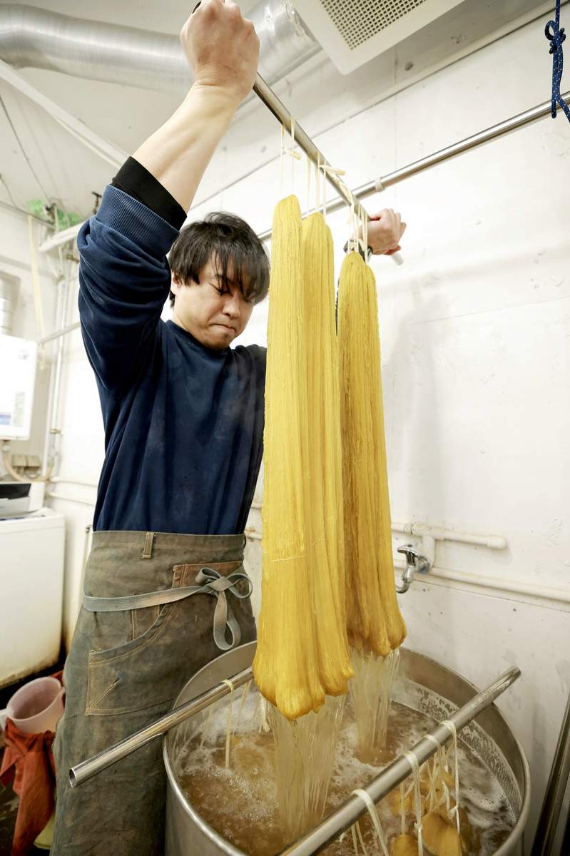 The dyeing process takes place at a separate location. In addition to plants traditionally used for dyeing, such as madder plants with red roots and indigo plants that produce blue tones, he also uses ingredients like onion skins and tea leaves. Onion skins naturally produce orange, yellow and moss green, according to Komuro.