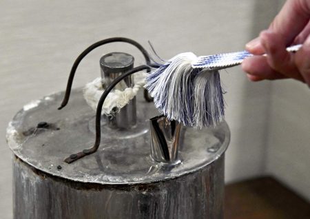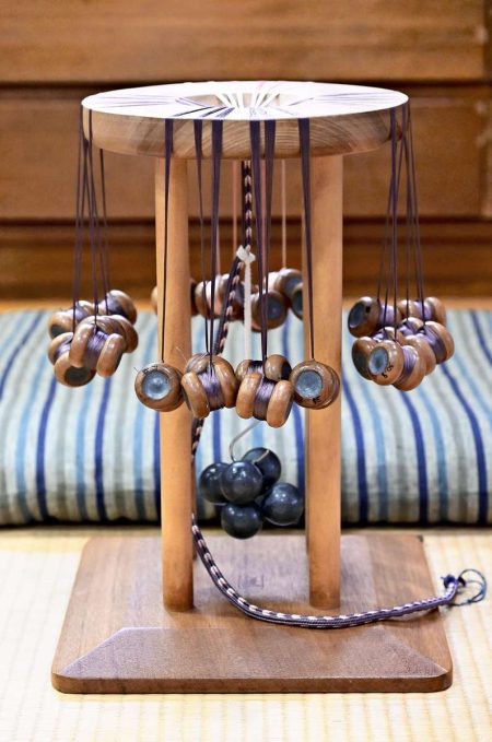 The length of the dyed threads is then adjusted. Threads are wrapped around lead weights called tedama and wound together on a braiding stand called a kumidai. About 900 to 1,200 threads are used to make a 150- to 160-centimeter-long obijime, according to Nakamura. It takes three days to two weeks to complete an obijime cord.