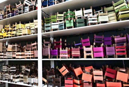 The creation of obijime using kumihimo techniques begins with about 30 types of paints being mixed to create dyes. These dyes are then applied to raw silk, giving it colors such as gold, purple and green. Nakamurasho stocks threads in about 150 colors, including about 20 just in red tones.