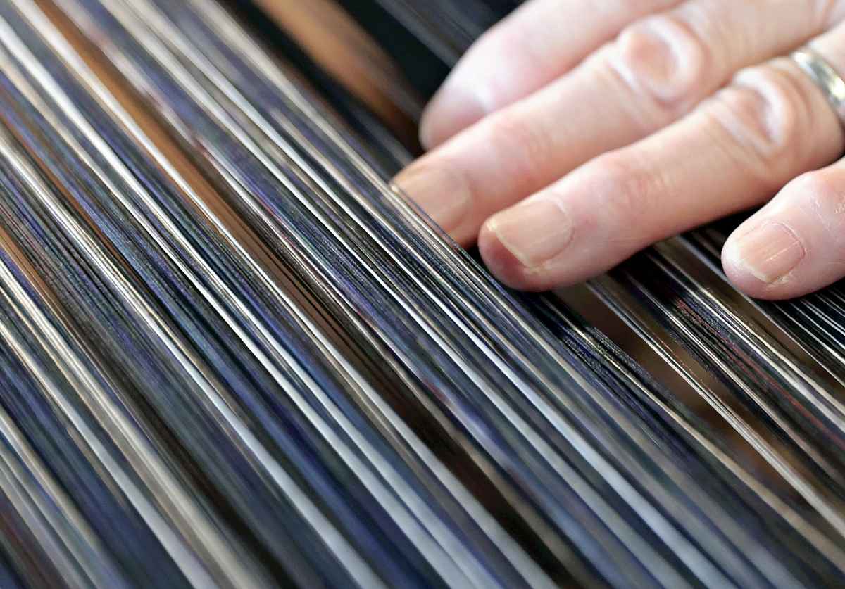 On the seasoned loom, 10,000 warp threads in various colors were arranged. For complex patterns like gradients, arranging each thread individually can take one month. For the weft threads, a dozen or so strands finer than hair are gathered without twisting, moistened with water, and combined into one.