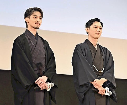 Ryo Yoshizawa, right, and Ryusei Yokohama, the lead actors in “Kokuho,” are seen at the Kabukiza Theatre in Chuo Ward, Tokyo, on Wednesday.
