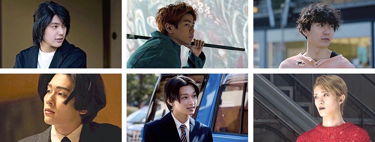 Clockwise from top left: Toru Shirase (played by Towa Araki), Sho Ishioka (Kodai Kurosaki), Dai Kuroiwa (Ikuho Akitani), Hikaru Akabane (Jutaro Yamanaka), Ao Fukazawa (Leo Matsumoto) and Itaru Sakaki (Ichikawa Somegoro) — These six young men are made into human specimens.
