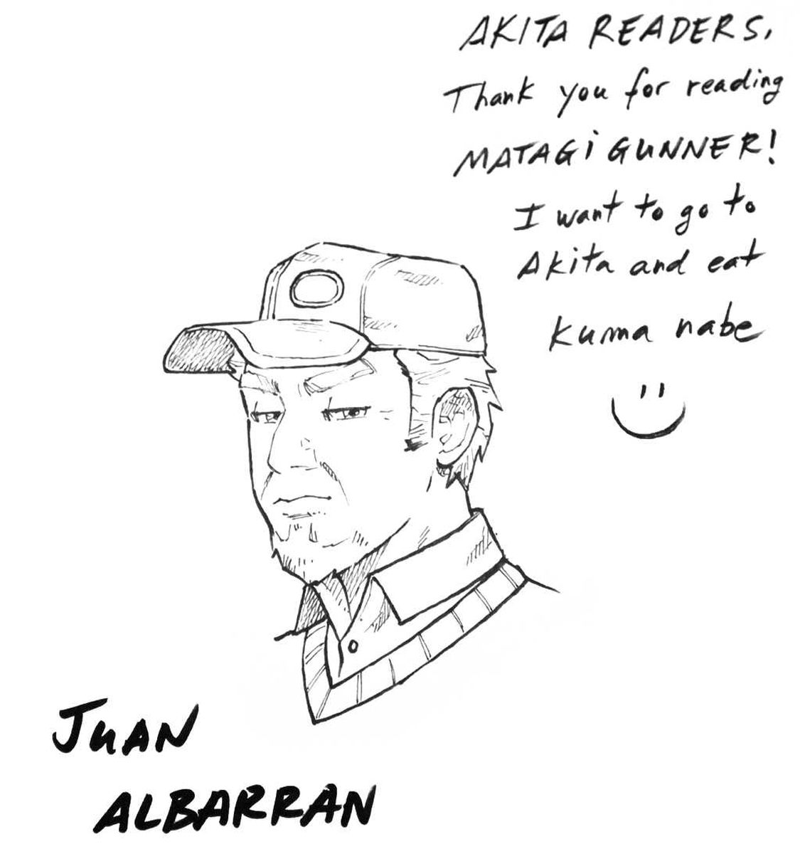 Albarran was born in Barcelona and learned how to draw cartoons at a technical school. After graduating from university, he went to the United States where he worked as a company employee. When he was in his late 30s, he became a drawing assistant at a famous American comic magazine. He eventually quit the company and returned to his hometown. During the COVID-19 pandemic, he started receiving fewer drawing job offers, so he decided to become an assistant to a Japanese mangaka because he was able to do the job remotely from Barcelona. He ended up becoming an assistant of mangaka Masamichi Sato, who gave him an introduction that led to “Matagi Gunner” and Albarran making his debut as a professional mangaka.