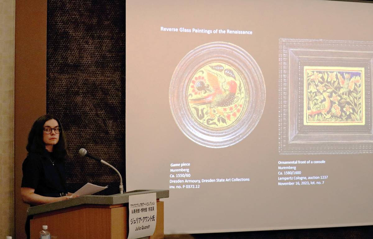 Julia Quandt gives a lecture on the history of glass paintings in Hamamatsu, Shizuoka Prefecture, on July 19.