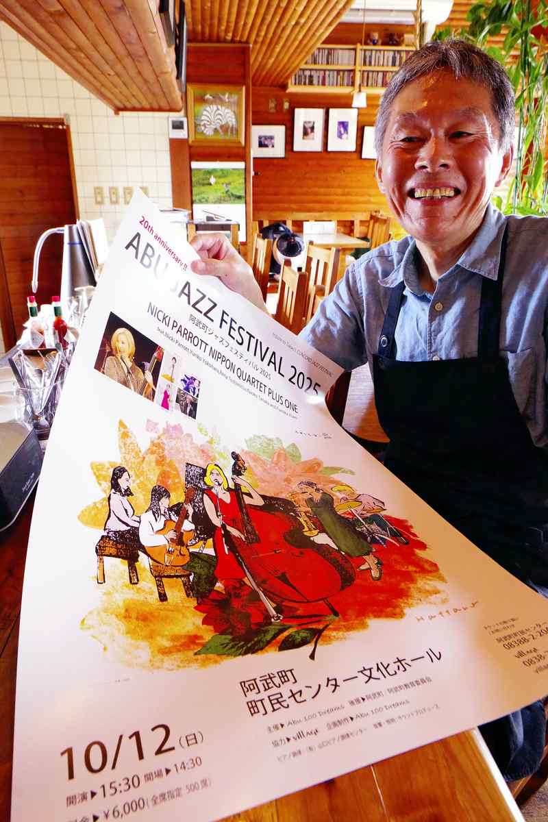 Yoshitaka Masumoto, the owner of jazz cafe Village, holds an Abu Jazz Festival poster.