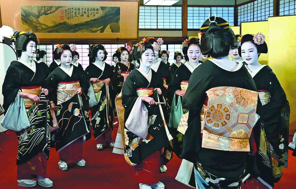 At the Gion Kobu Kaburenjo theater in Higashiyama Ward, Kyoto, about 80 geiko and maiko gathered and chanted their pledge, “We take pride in tradition and will strive to master our arts.”