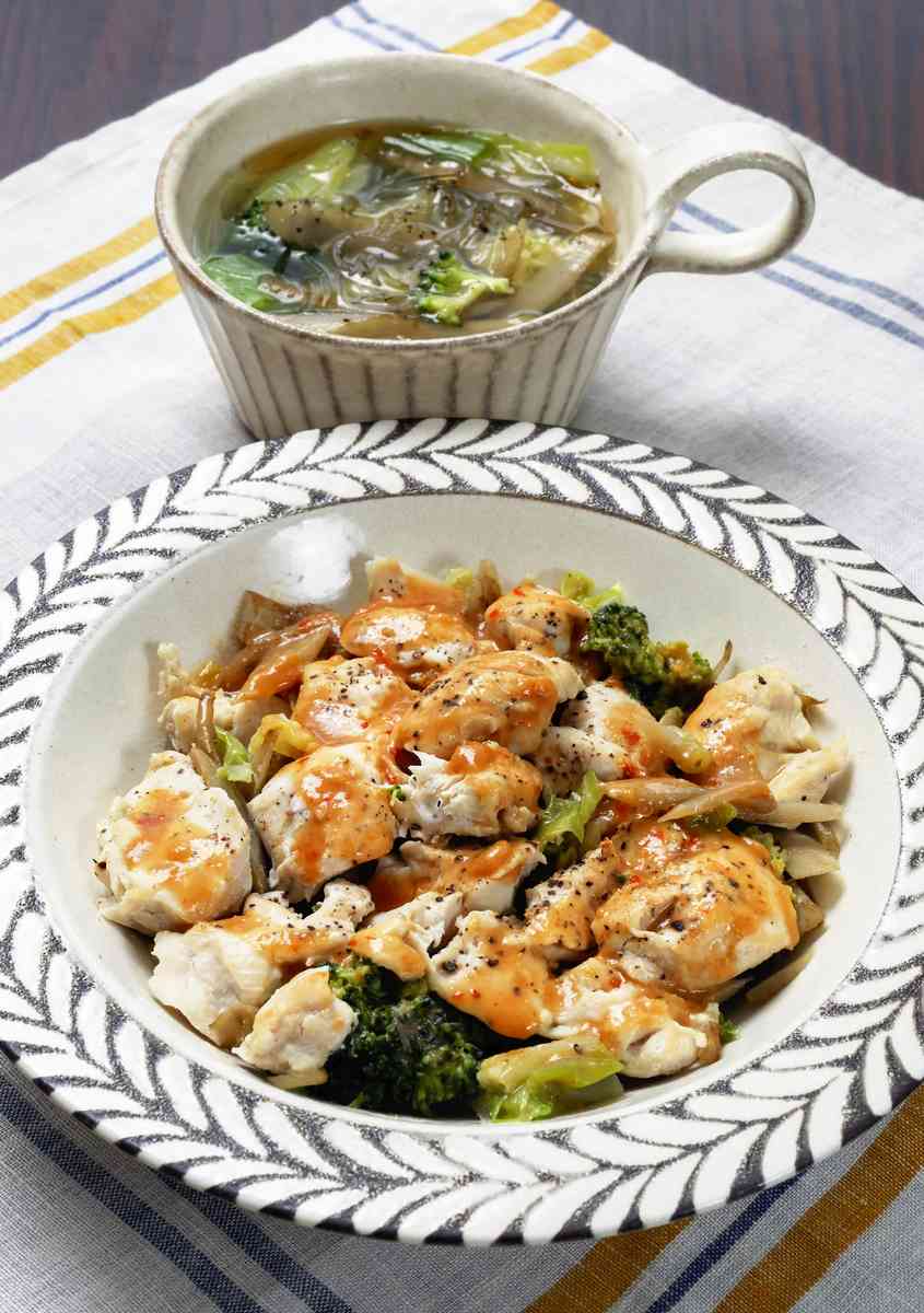 Microwave steamed spicy miso chicken and vegetable , front, and clear vegetable and glass noodle soup
