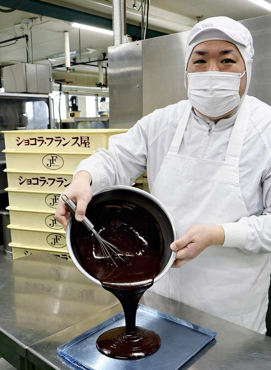 Shinsuke Nakahara pours melted chocolate onto a tray at Confiserie Furansuya in Fushimi Ward, Kyoto.