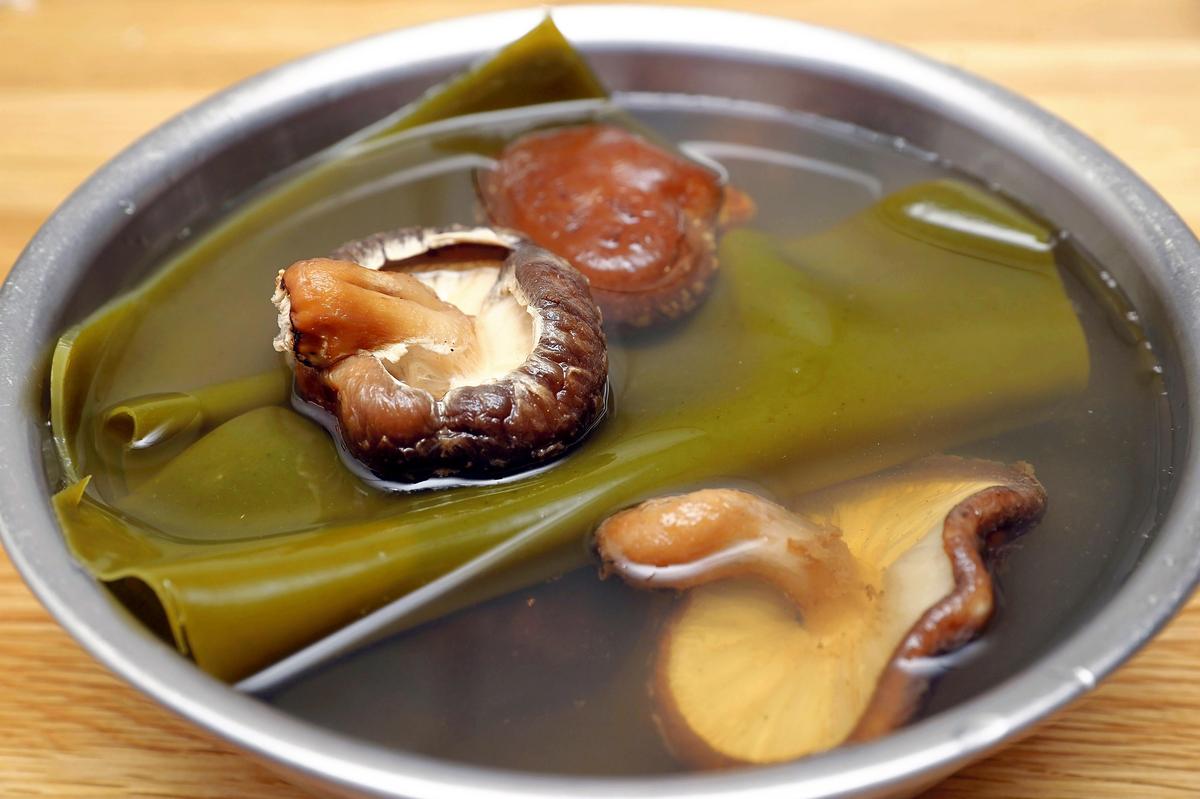 1. Place 1.2 liters of water in a bowl or similar container. Add lightly washed dried shiitake mushrooms and gently wiped kombu. Soak overnight in the refrigerator.