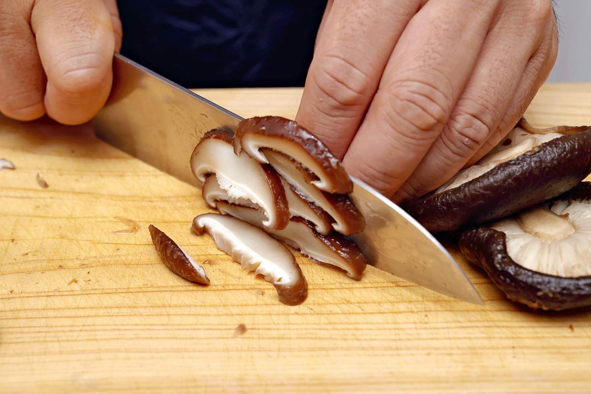 Soak the shiitake mushrooms in water, then slice into 5-millimeter-thick pieces.