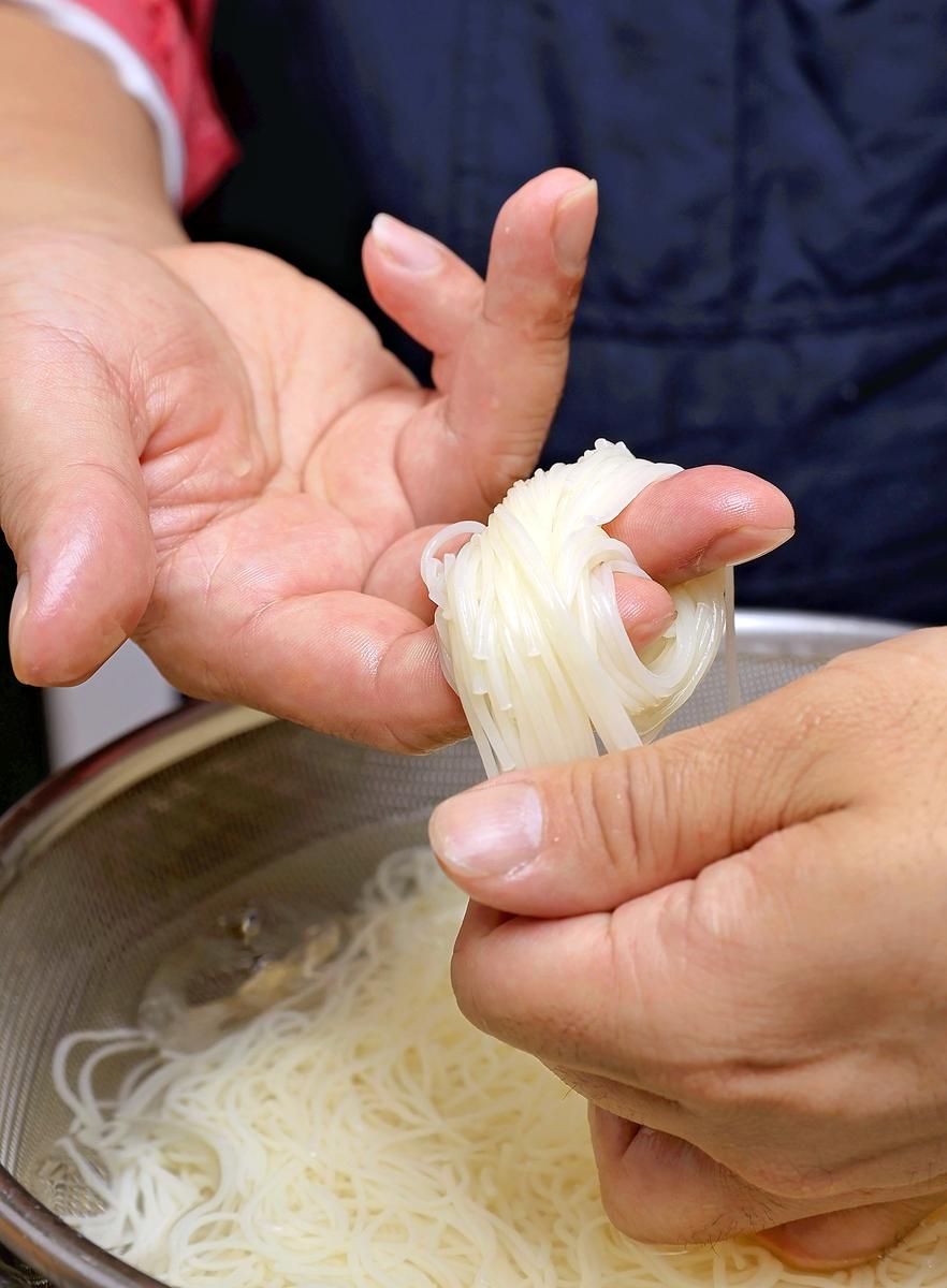 To improve the texture of the noodles, rinse the slipperiness off the surface thoroughly before chilling. To drain excess water, make them easy to pick up and improve presentation, arrange the noodles into ring shapes by wrapping a suitable amount around your fingers to make bite-sized portions.