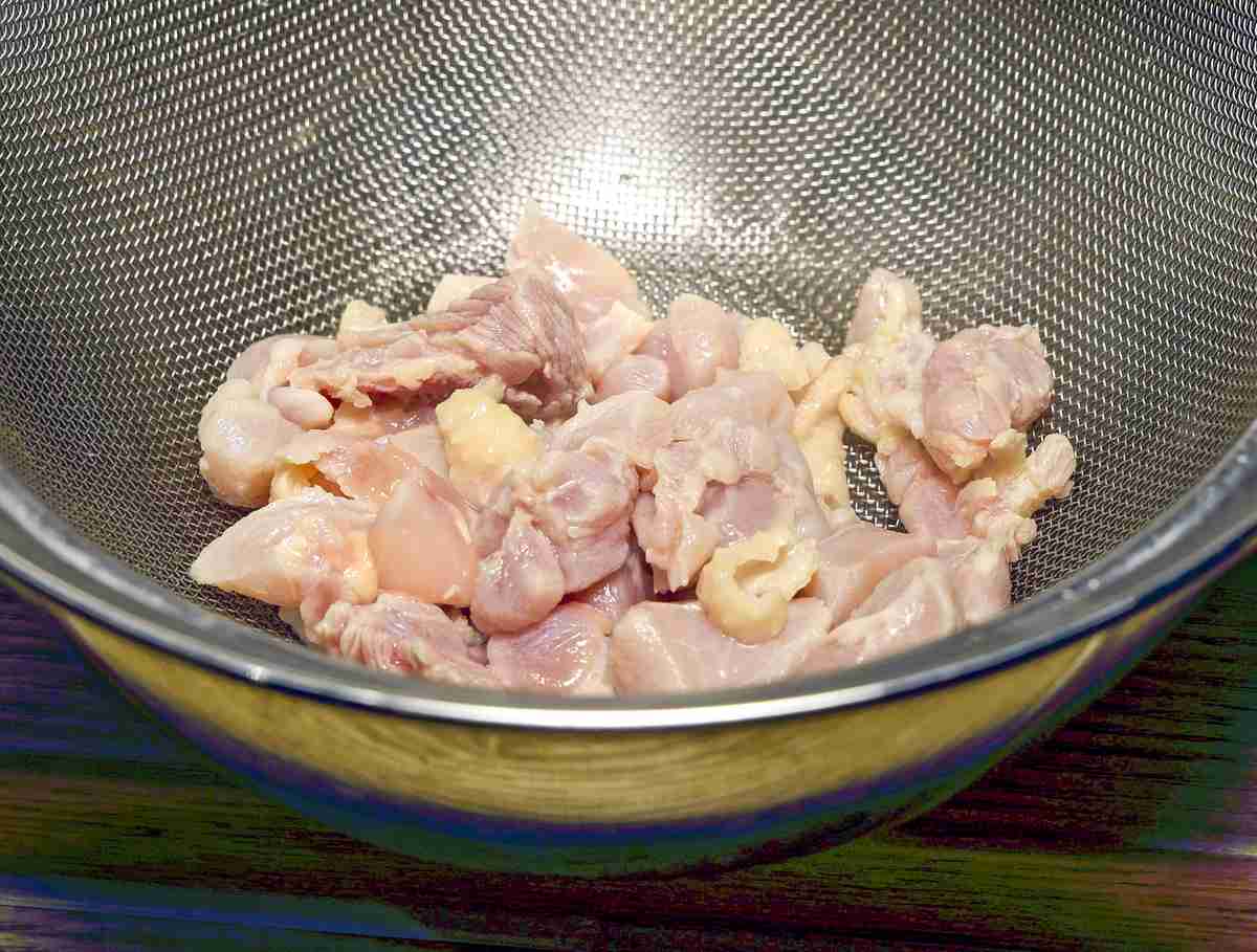 2. Cut the chicken into small, bite-sized pieces and place them in a bowl. Sprinkle with 1/2 teaspoon salt and rub until sticky. Pour hot water over the chicken so the outside begins turning white, then drain in a colander.
