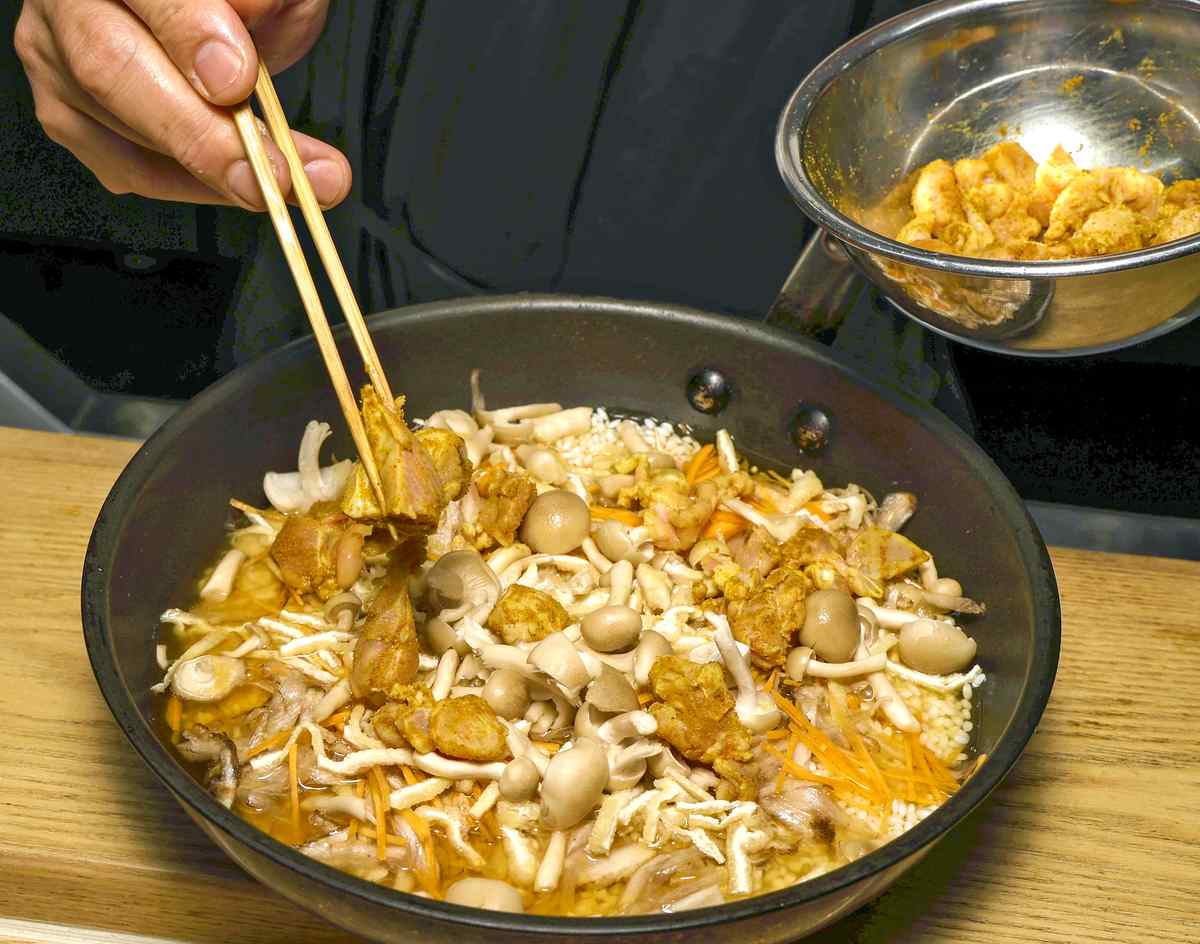 To cook, place the rice in a frying pan, add the other ingredients, pour in the dashi, then top with the chicken before turning on the heat. It is crucial not to mix the rice and ingredients at this stage. This prevents uneven cooking and stops the curry powder on the chicken from burning.