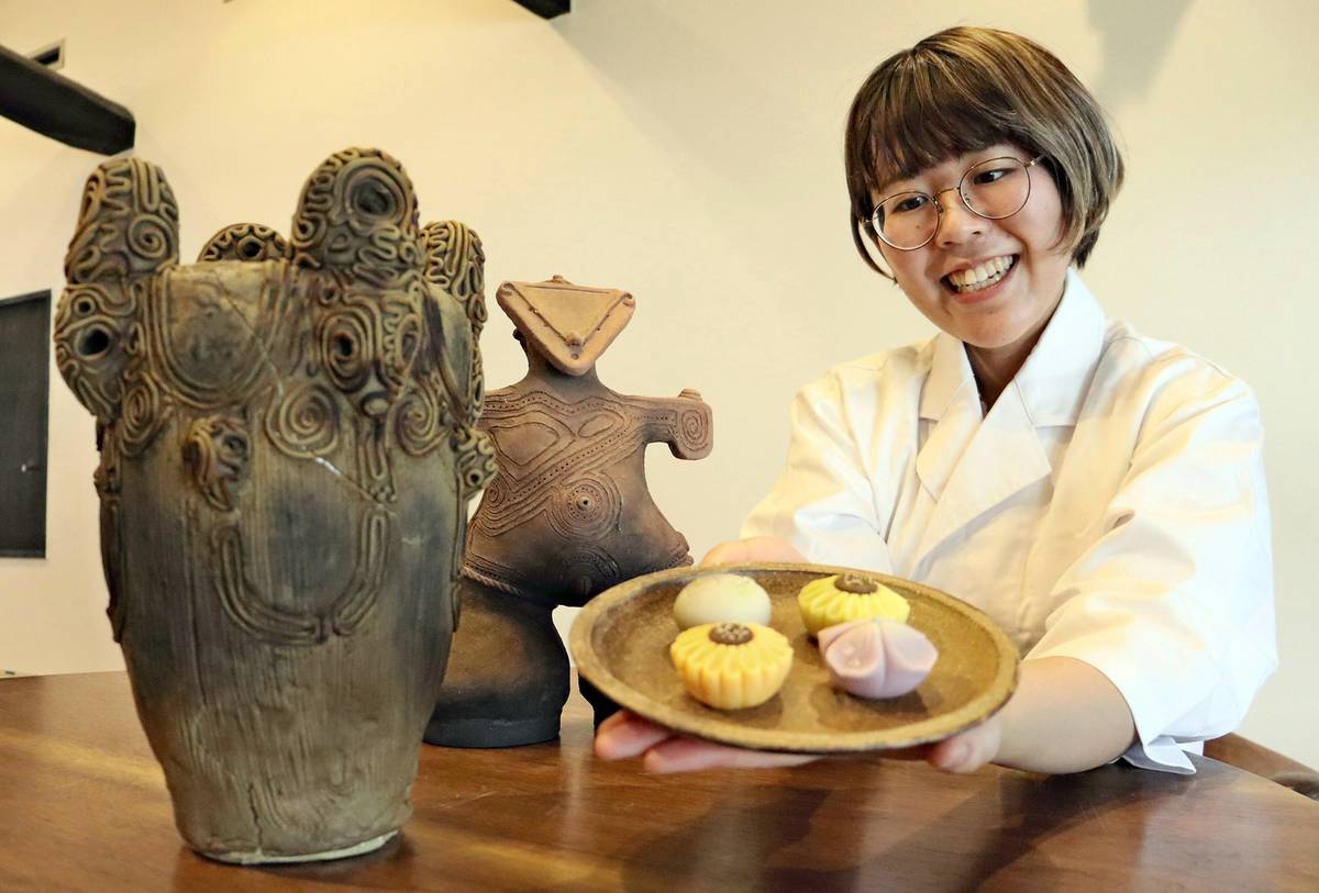 Natsuko Takahashi holds a plate of wagashi sweets next to edible sweets that look like Jomon-period pottery pieces, left, in Hokuto, Yamanashi Prefecture, on July 4.
