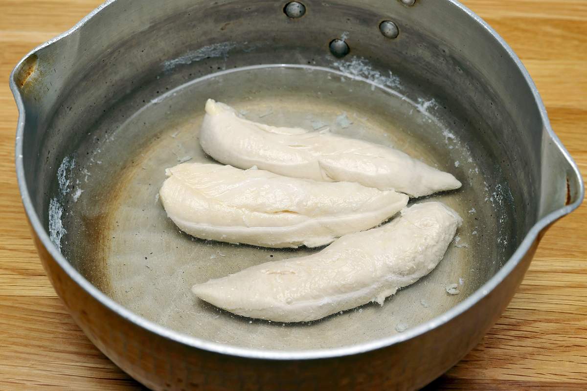 First, making the boiled chicken. After letting the tenderloins rest until they reach room temperature from refrigerator, place in a pot with water and let boil.