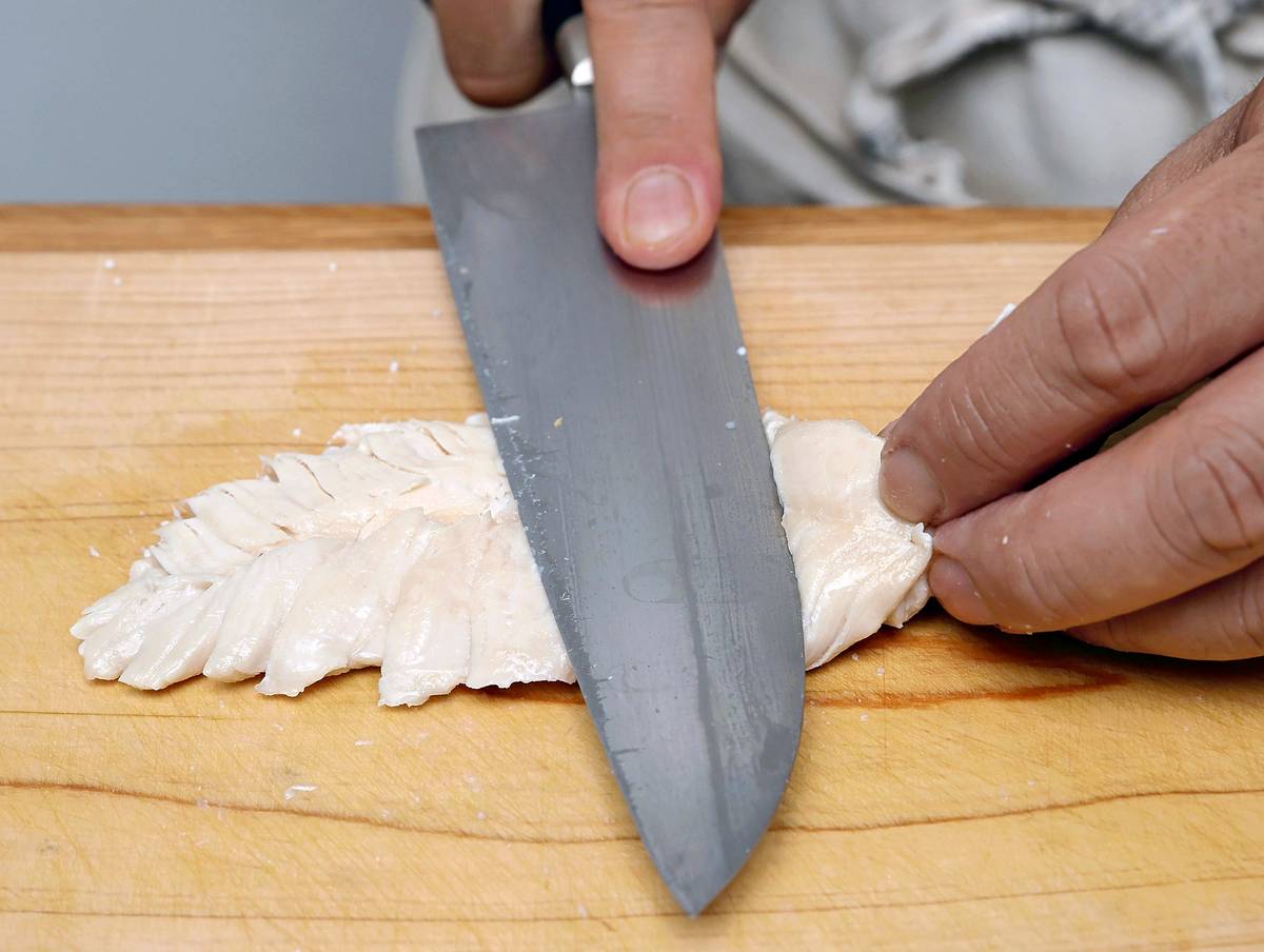 4. Pound the chicken from Step 1 with the flat side of a kitchen knife, then shred into thin strips.