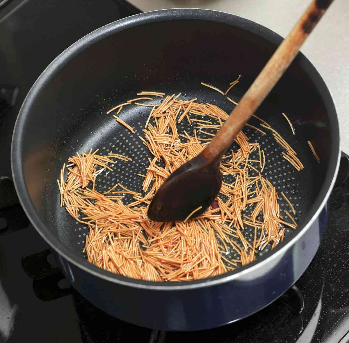 3. Heat 1 1/2 tablespoons of oil in a pot. Saute the shariyah until it is deeply browned.