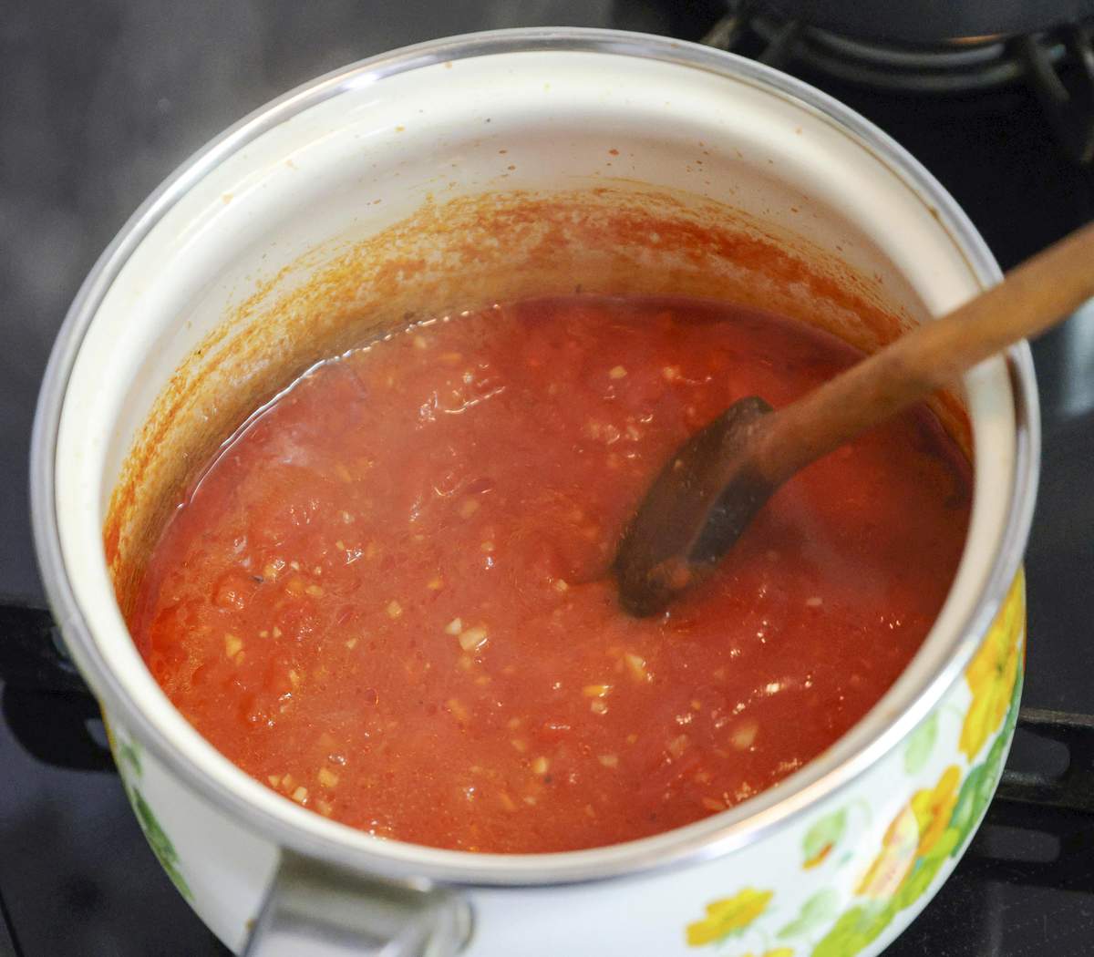 5. To make the sauce, heat 1 1/2 tablespoons of oil in a pot and saute the minced garlic until fragrant. Add 1 1/2 tablespoons vinegar, the tomato paste and canned tomatoes. Simmer until thickened.