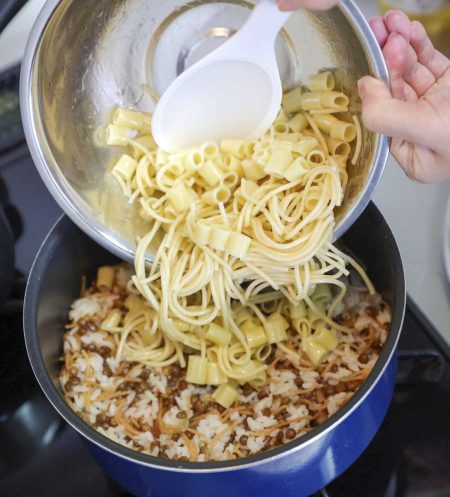 7. Mix the macaroni and spaghetti into the cooked rice and put the mixture on a plate. Top with sauce, and garnish with the fried onions and chickpeas.