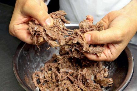 3. Take the beef out of the pot, pull it apart by hand and put it in a bowl.