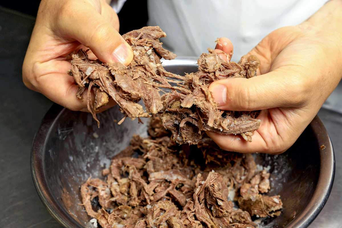 Condito means “seasoned,” as the meat is generously seasoned twice, when it is cooked with aromatic vegetables and when it is pulled apart and mixed with a seasoning liquid. In the second stage, the amount of salt and other seasonings can be adjusted.