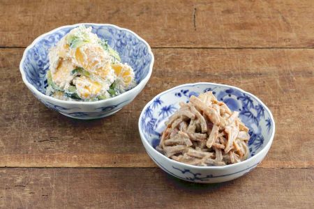 Culinary researcher Ryuta Kijima introduces the classical home-style dishes of daikon radish with walnut dressing and persimmon shiraae mashed tofu salad.