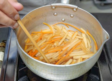 For the dish, daikon radishes and carrots are simmered just enough to retain a crisp texture. They are then cooled.