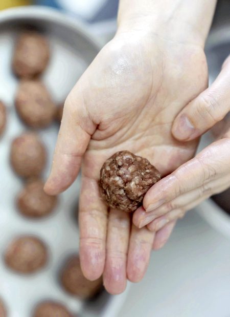 Syrian meatballs contain almost no binding agent, giving them a firmer texture. To make them easier to eat, Komatsu’s recipe adds coarsely grated onion. Since they have little binding agent, they need to be mixed and kneaded well. Then, pan-fry the mixture in small balls until browned to develop a nice aroma.