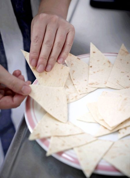 For the round flatbread, tortillas can be used. Cut each tortilla into eight or so equal triangles and arrange them attractively along the edge of the plate. This is a common arrangement in the Middle East, Komatsu says.