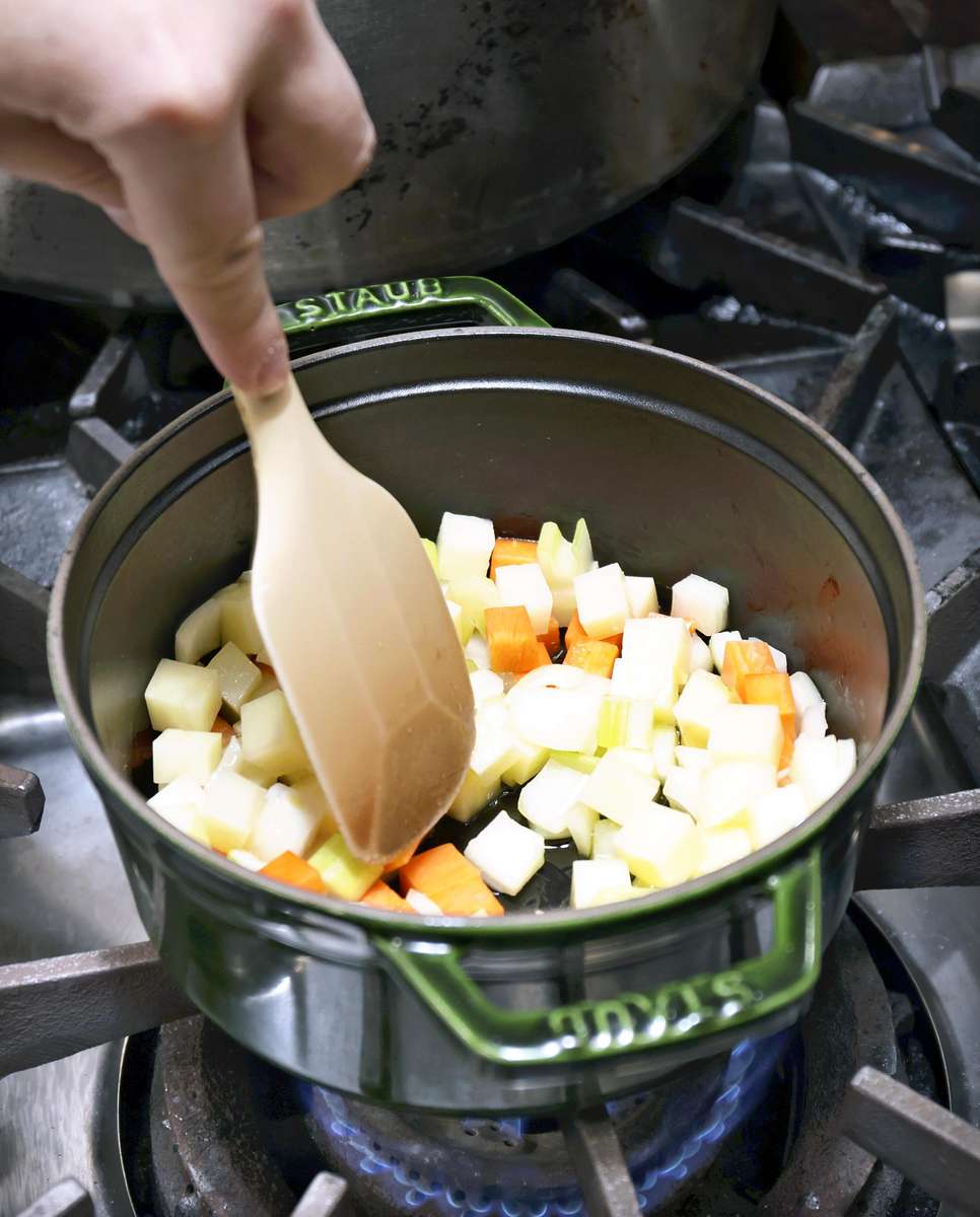 2. Heat olive oil in a pot and lightly saute the potato, onion, carrot and celery. Cover with a lid, lower the heat and steam for 3 minutes.