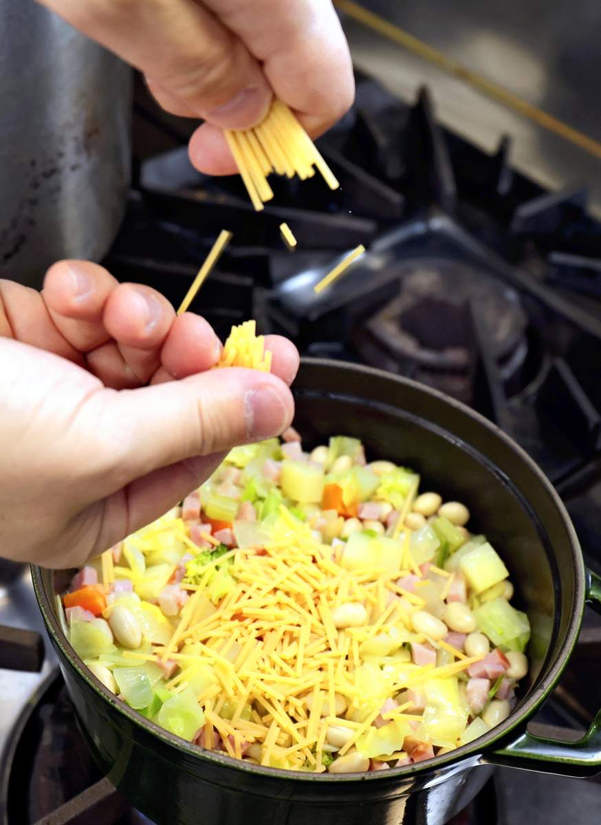 Soybeans and spaghetti are added, sauteed and simmered in bouillon to complete the dish. The addition of beans is reportedly popular in Italy. With spaghetti, the dish becomes more hearty and nutritionally balanced.