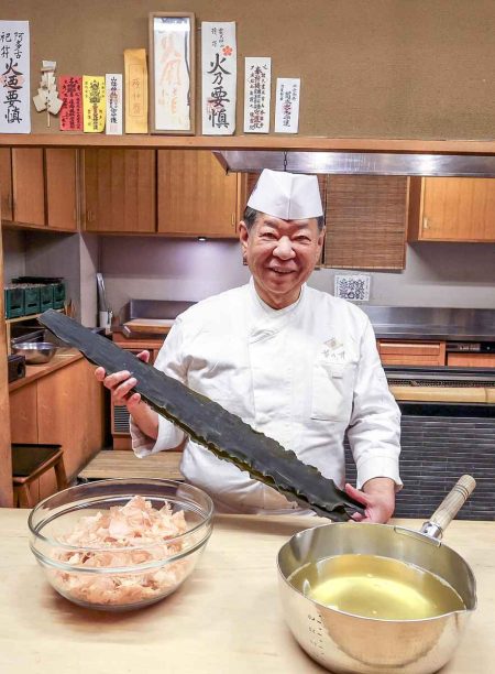 Murata holds kombu at Akasaka Kikunoi in Minato Ward, Tokyo.