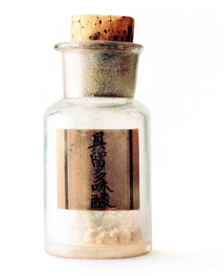 A glass jar containing glutamic acid extracted from kombu by Kikunae Ikeda
