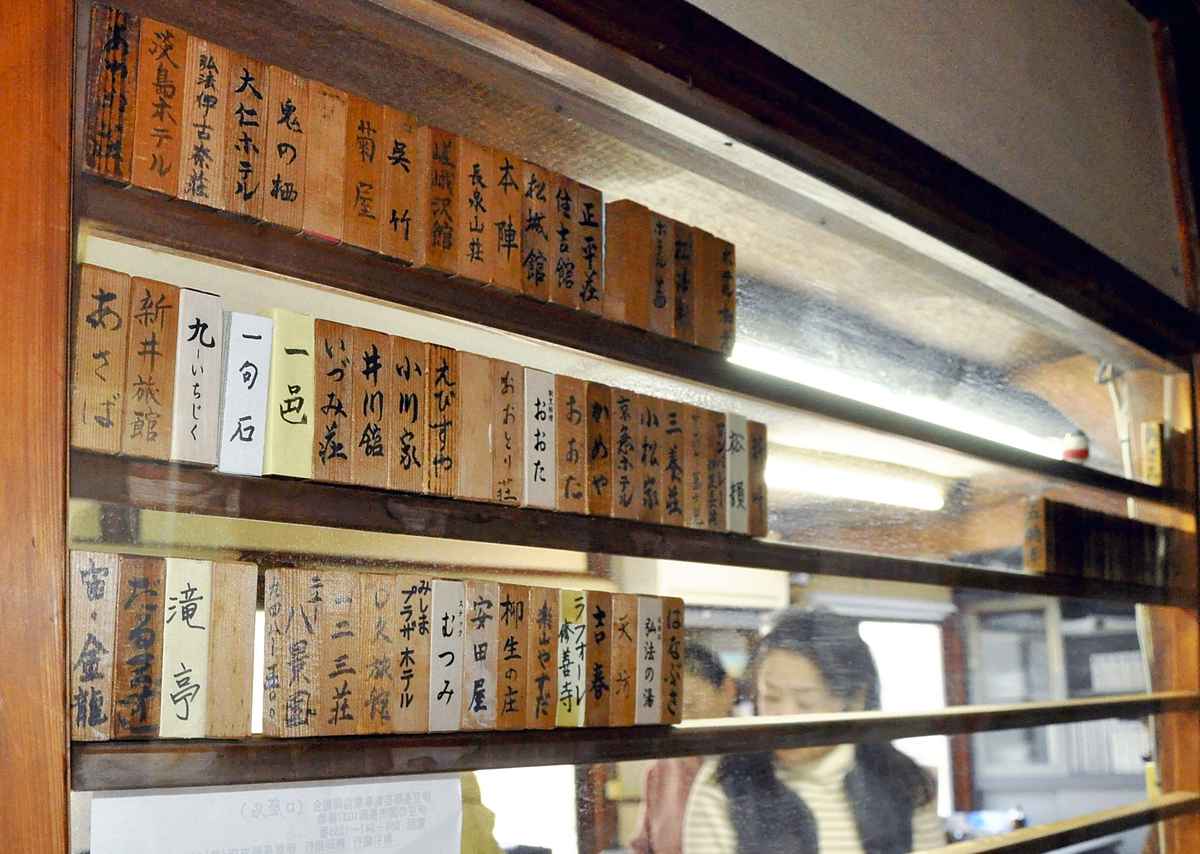 Wooden nameplates show the names of past and present geigi women and the ryokan inns where they have performed.