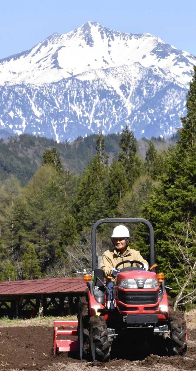 A farmer works field in Takayama, Gifu Prefecture, on Thursday. Lingering snow on Mt. Kasagatake in the background takes the shape of a white horse.