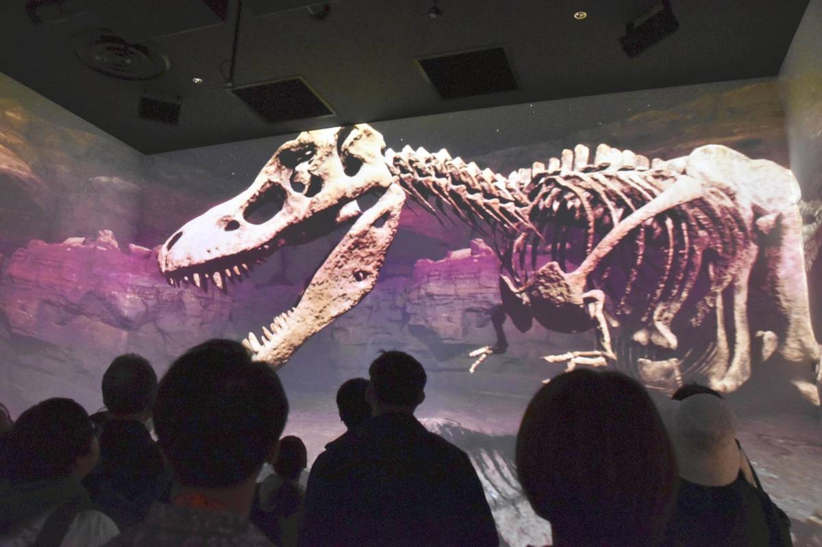 Fukui Prefecture, which calls itself “Dinosaur Kingdom,” features virtual reality images of Fukuiraptor, whose fossils were excavated in the prefecture, and other dinosaurs on massive screens. Screens are installed in front, behind and on both sides of visitors, allowing them to experience dynamic images of dinosaurs on the attack, with realistic sound effects for their footsteps and roars.