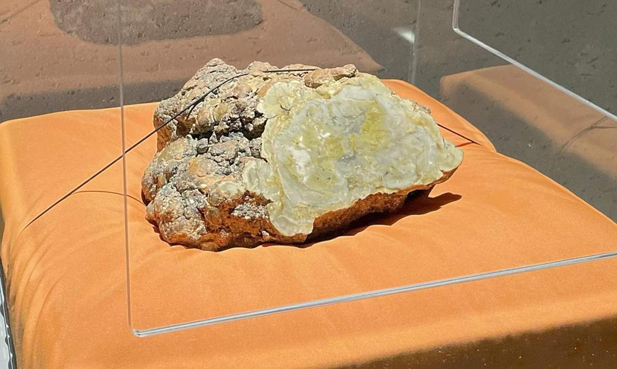 Another highlight of the Fukui booth is the display of a dinosaur’s coprolite, an item from the Fukui Prefectural Dinosaur Museum’s collection. The fossil, which is 23 centimeters long and 14 centimeters wide, is believed to be from the Jurassic period (about 200 million to 145 million years ago) and was excavated in Utah. Visitors can touch it through the hole in the display case.